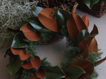 マグノリアリーフを使って作る 大人の雰囲気漂うリースです。 ドライになると葉に動きが出ます。 ドライになって違う表情を見せるリースもお楽しみいただけるかなと思います。 クリスマス時期だけでなく 年間通して飾っていただけるリースになれば嬉しいです。 特徴的な葉は その使い…