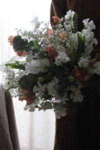 春の花・スイトピーをたっぷり使う花束は可憐で軽やか。この軽快さと穏やかさはスイトピーならではの表情だなと思うんです。とても魅力的です。