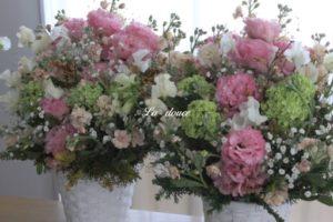 こちらは三回忌のご法事のお供えとしてお作りしました一対のアレンジメントです。パッと華やかなお花は「こんな感じの花が好きだった」というお話しをお伺いして。